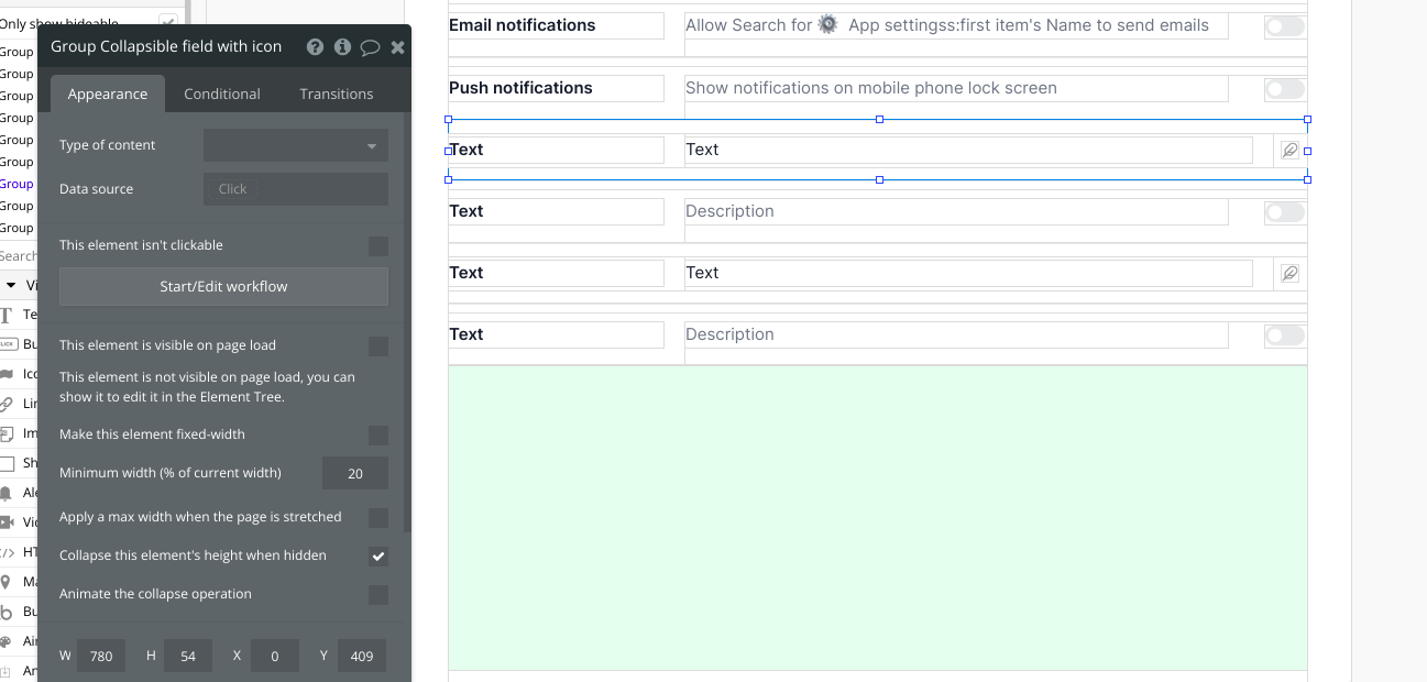 This group includes a bolded title, description, and a Canvas toggle. Please ensure your Canvas UI elements plugin is on the latest plugin version (Bubble editor > Plugins > Canvas UI elements). When the toggle value is changed, a workflow to trigger an AirAlert will fire.&#x20;