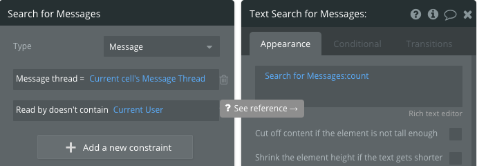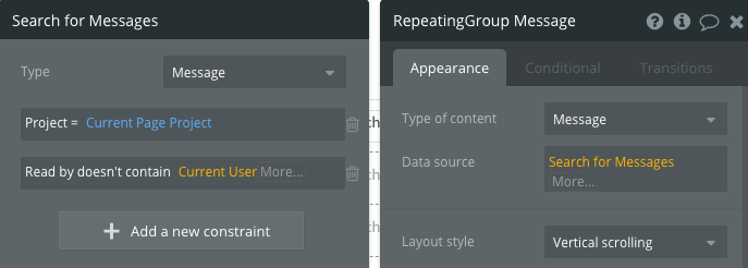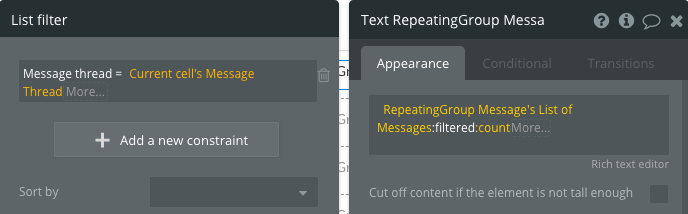 Any time you put something into a Repeating Group, you should keep in mind that whatever you put in there will happen multiple times, once per each row of the RG. Let's imagine that we are building a messenger and want to display a list of threads along with the number of unread messages in each thread (that is messages that are unread by the current user). Here's how we may structure that: