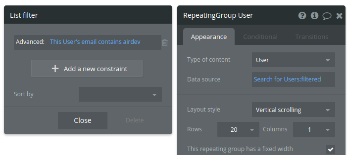 In this example, we need to find all of the users whose email address contains a certain text, which in this case is pre-defined as "airdev". If we do this using advanced filters, the application will download a batch of users into the browser, check if they match this condition, and download another batch if the matching users don't fill up the repeating group. Depending on how many users you have, that could take a long time - in this case on an app with 900 users, it downloaded around 300 users onto the page, 4mb of data, and took 20 seconds longer than it normally would to load the page.