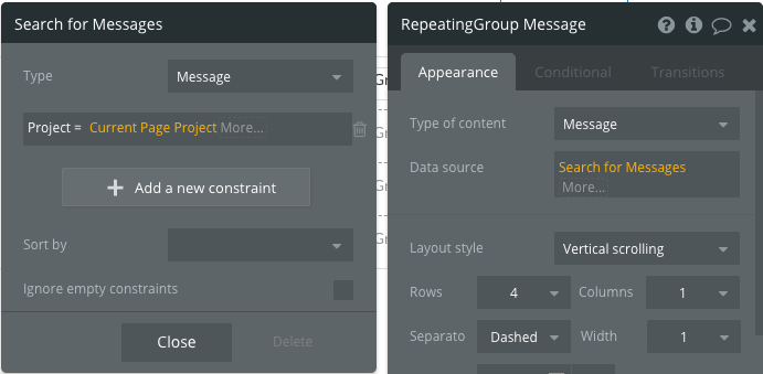 Let's imagine a data structure where there is a single Project that has multiple Message Threads, each of which has multiple Messages. If you want to find all messages within a particular project, you may want to do a search like the one below, where you find all messages that belong to threads that are linked to a project. However, this nested search (search inside a search) will take longer because Bubble first has to find all of the threads that belong to a project and then find all of the messages that belong to one of those threads.