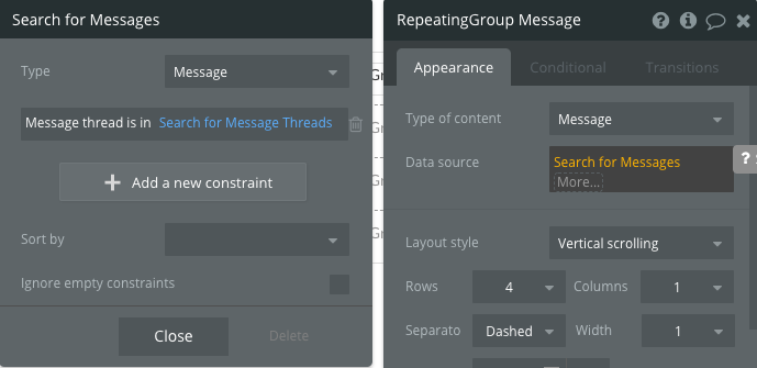 Ignore empty constraints. This is the easiest but is also sometimes bad advice because this feature can keep your search expressions cleaner. For example, if you have a repeating group that you want to show all of the users and a search box on top of that repeating group that the user can enter a keyword in to filter the repeating group, you can use theIgnore empty constraintsoption to get away with using a single search expression for the repeating group.Make sure that the constraint is never empty. This is harder to do than it seems - in the example above, we can set