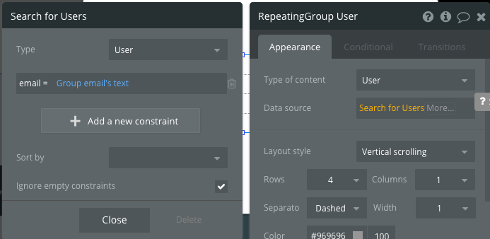 Group email'svalueWhen page is loadedbut, if you do that, there will be a split second before the page is loaded, when the group is empty. And during that time your repeating group may try to load all of the Users into it, which will slow the entire application down.Conditionally set the search expression only if the constraint value isn't empty, which ensures that the search is not performed until it's ready to be performed.