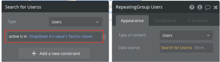 To see how we use this in Canvas, check out the dropdown to filter users by active status on the admin page of your app. It can be found in the elements tree by clicking the '+' to open Group Main Content > Group Nav 8 - Users > Group User header > Dropdown Users.