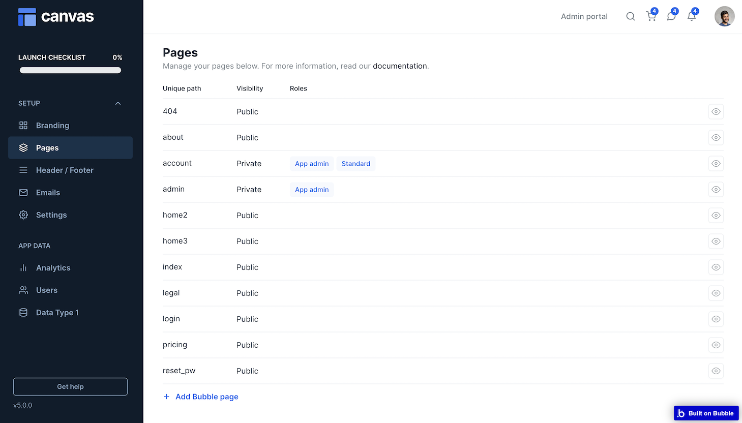 As an admin, you'll be able to view all the Bubble pages in your Canvas app from the 'Pages' tab in the admin portal. The unique paths for your pages here should match the actual page names in your Bubble editor.