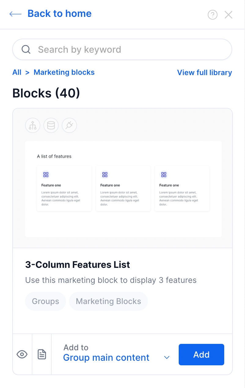 From the 'Add to' dropdown, select the group that you would like to add the block to. Click the 'Add' button to start building out your marketing page.