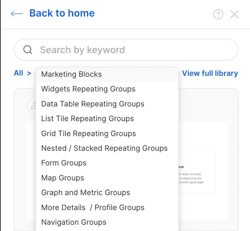 From the 'select category' dropdown, select Marketing Blocks to filter on marketing block templates only.