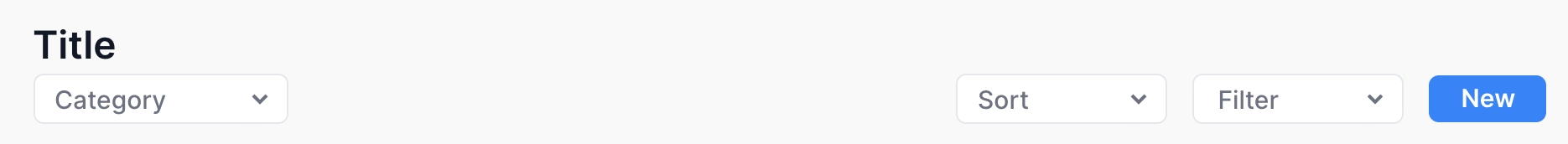 Most blocks will include a standard title group. This group includes common UI components such as a title, dropdown, toggle tabs, description text, sort dropdown, filters, and a 'new' button.