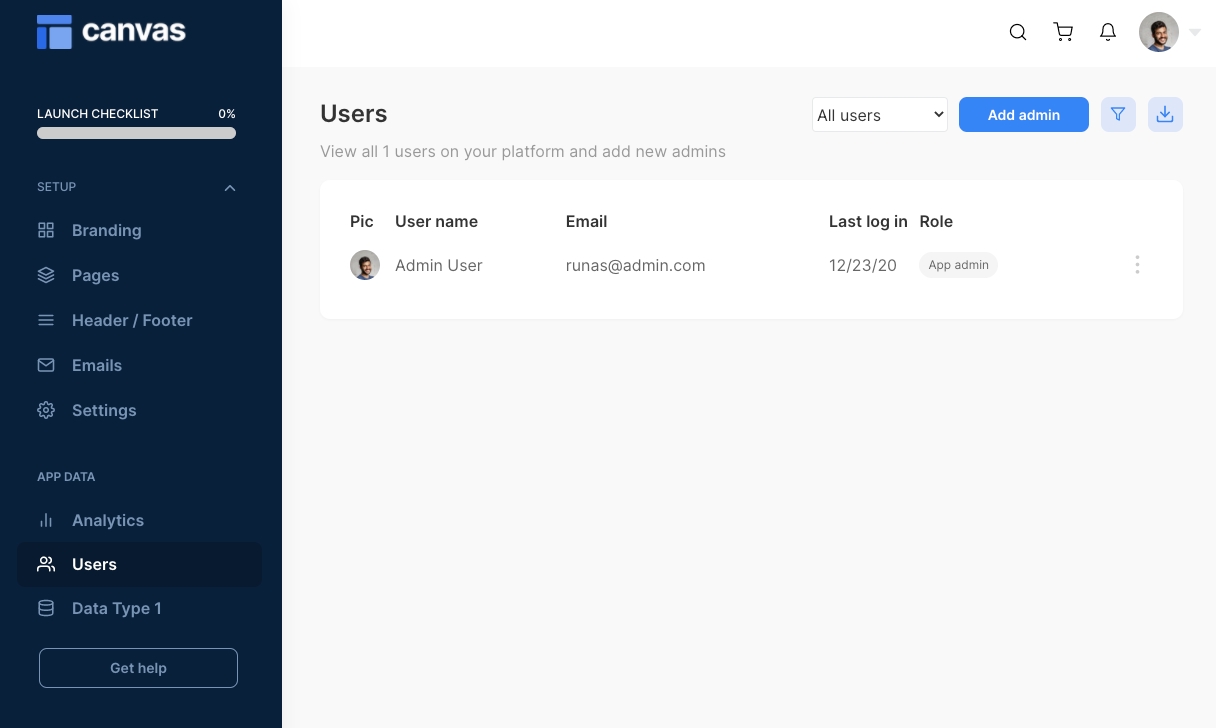 Your app will come with a dedicated portal for the app’s admin where you can manage app settings & data. Much of this is preset for you, but you will have to customize the page for your app.