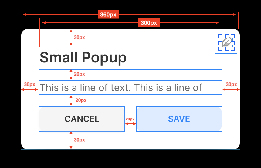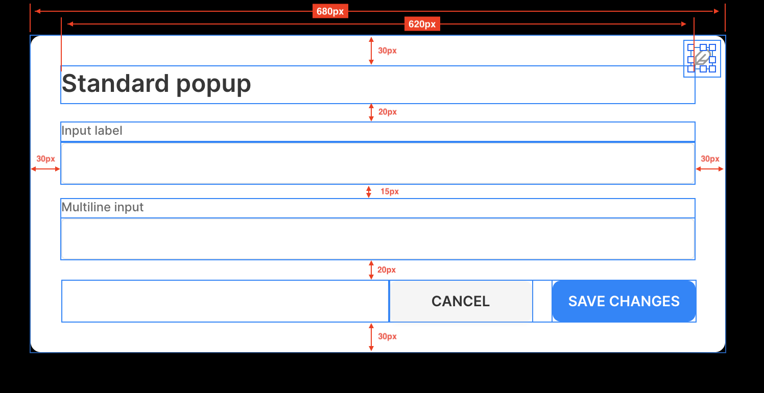 The Standard popup has a title, inputs, and a couple of buttons. The padding between main elements is 20px with the exception of the inputs. Padding between inputs is 15px.