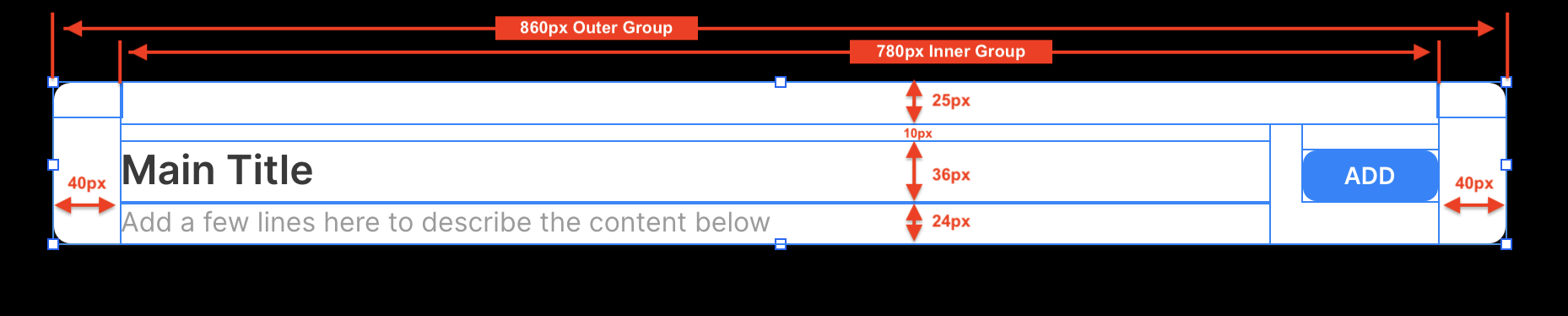 Outer Group: This group operates as a container for the entire section and has a width of 860px, a minimum width of 20%, and no maximum width set.