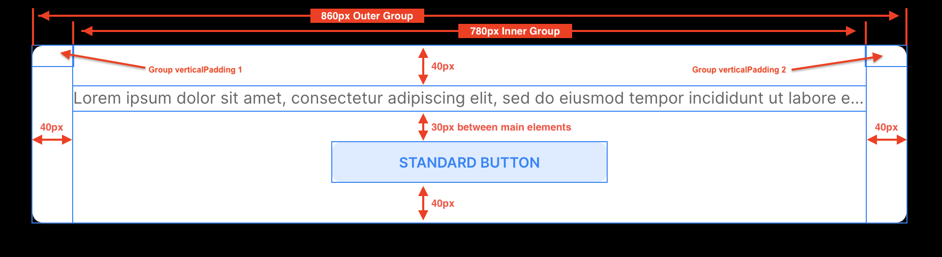 Padding Groups: There are two groups called Group verticalPadding 1 and Group verticalPadding 2 which are located at the top left and right of the outer group. These groups have a standard width of 40px, a minimum width of 50%, and no maximum width set and are used to maintain a dynamic padding distance between edges of the outer group and the inner group.