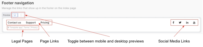 You can set up links to any page you like in the pages tab. These can be the same pages you set up in the header or completely different.
