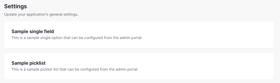 These options appear at the top of the list under the Settings tab in the Admin portal. The base template comes with two examples setup.