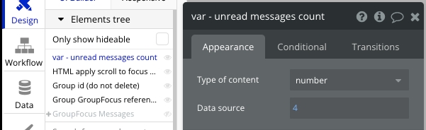 To set up the badge value, open one of the widgets listed above that has the option of a badge. For example, if open the widget_messages element in the Bubble editor, we can see a 'var-unread messages count' element in the elements tree that has a Data source value of 4.