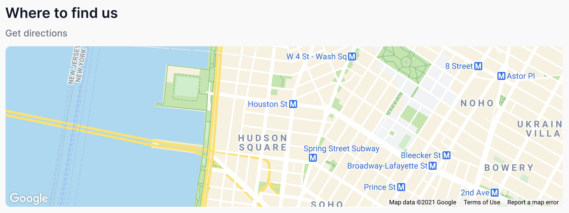 This is a fully-responsive block that includes a map element and a directions link. Clicking on the link will open google maps in a new tab for directions.
