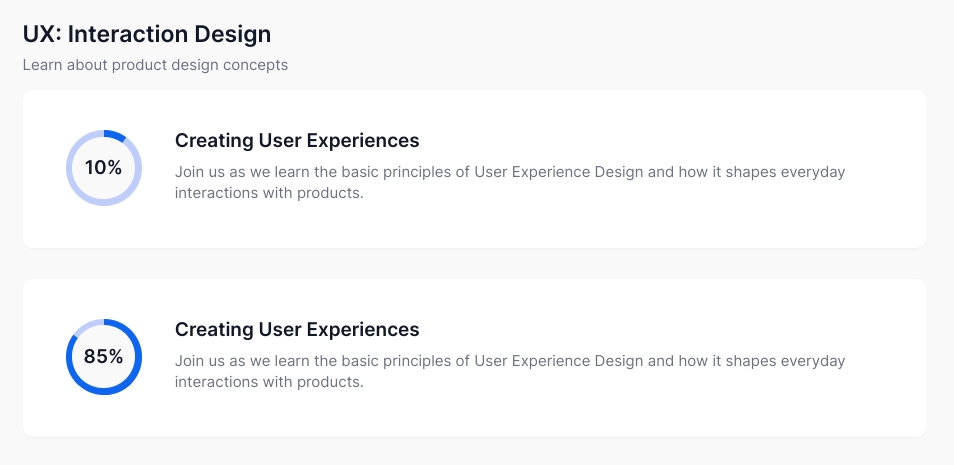 First, select HTML circular progress bar and you'll see the following code (bolded text represents where you'll input dynamic data): <div class="progress-circle p10" width=> <span>10%</span> <div class="left-half-clipper"> <div class="first-50-bar"></div> <div class="value-bar"></div> </div> </div> There is also a conditional statement that looks a bit different: <div class="progress-circle over50 p10" width=> <span>10%</span> <div class="left-half-clipper"> <div class="first-50-bar"></div> <div class="value-bar"></div> </div> </div>