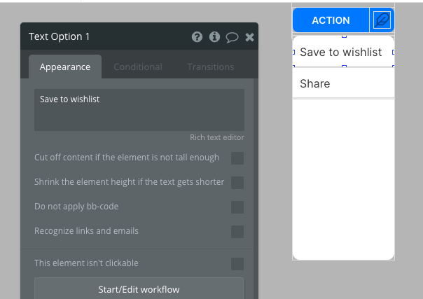 Go to new_buttonwithmenufocusgroup reusable element and add a workflow to Button Actions. Show or hide options groups in GroupFocus button. Add workflows to the options groups in the workflows tab.