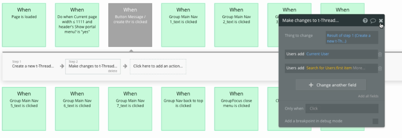 Group Main threads list_thread This group contains the list of threads that the current user is a part of. All of the threads are displayed in RepeatingGroup t-Thread. Clicking on Group Main select thread_thread will hide Group Main threads list_thread and show the messages for the selected thread.