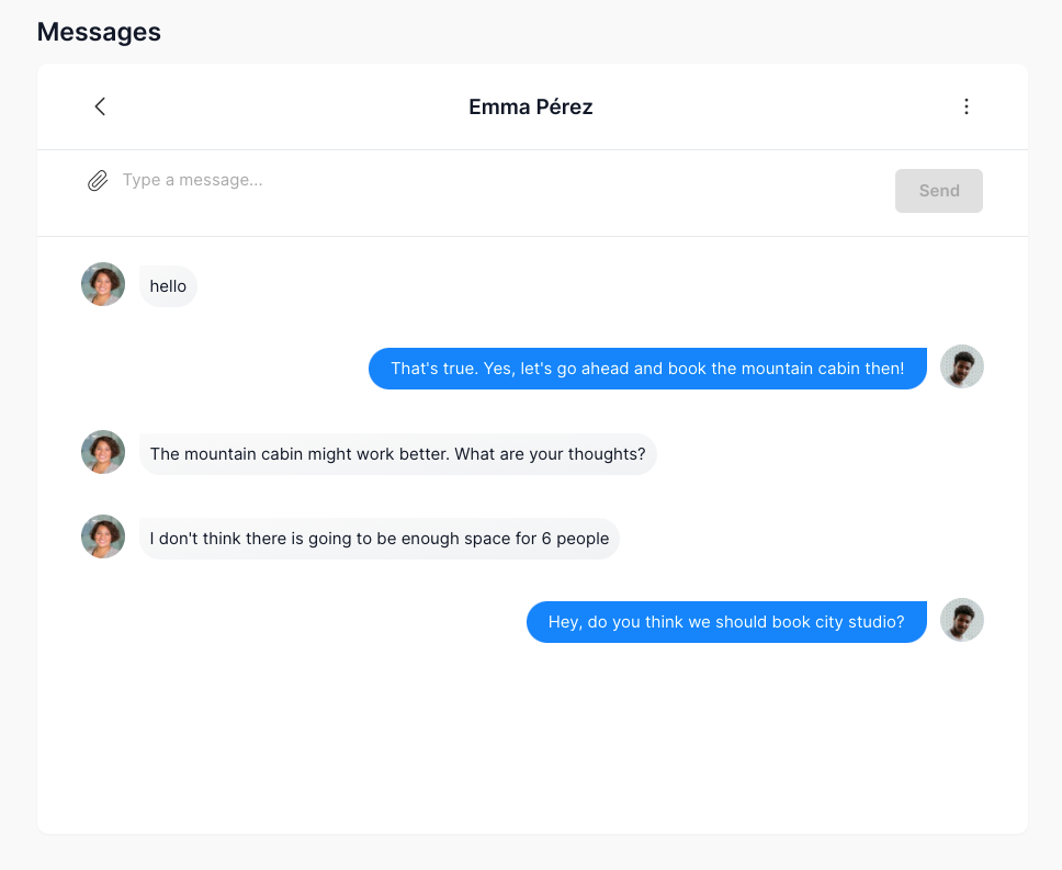Clicking on Group Inner Back to threads will navigate back to the list of threads. The user can enter a message in MultilineInput message and attach a file by clicking on the file clip icon. When an attachment is added, it will show underneath the message input. Clicking on it will open the attachment in a new tab for previewing. Clicking on Group Inner delete file will delete the attachment and allow you upload a new attachment.