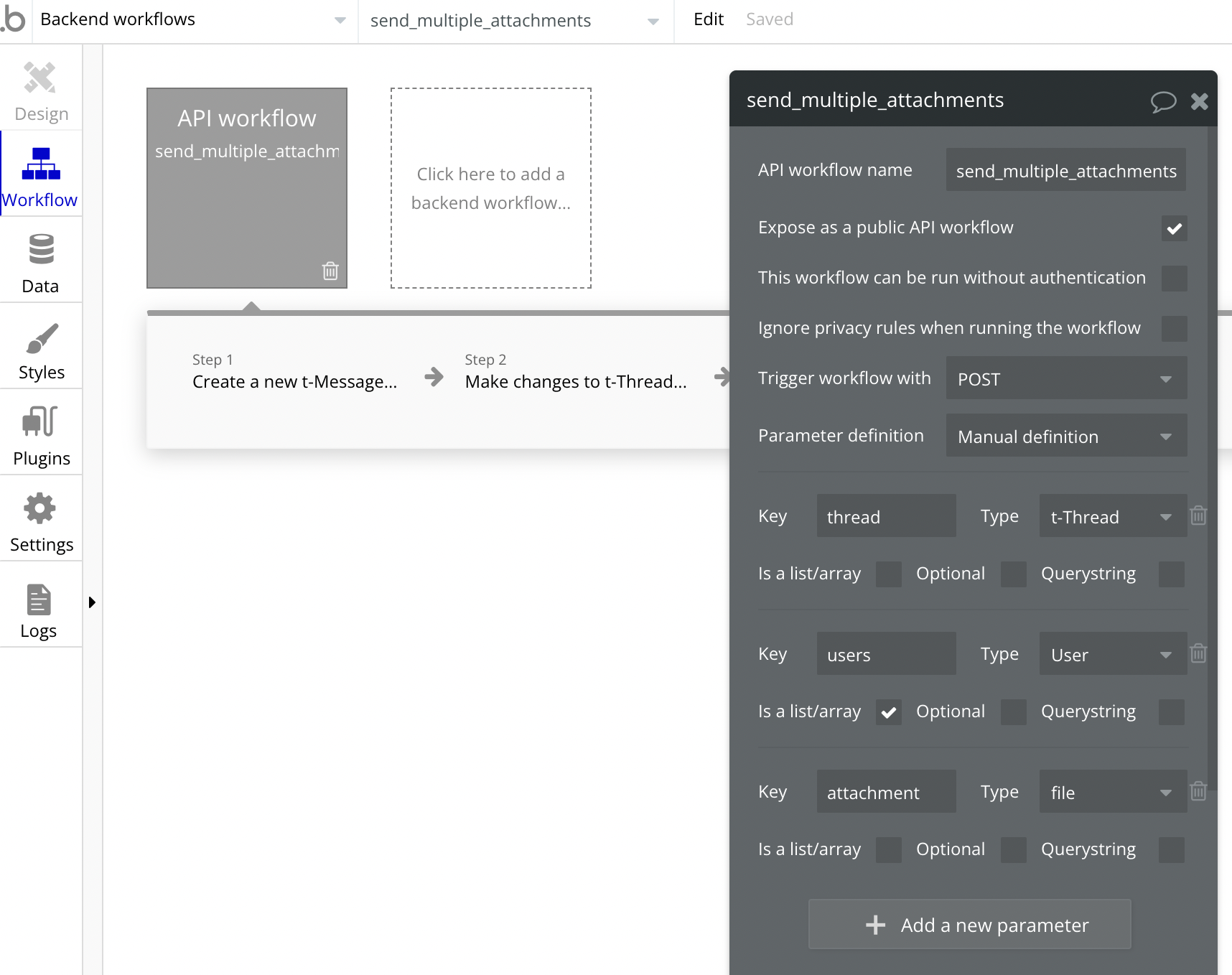 * By default, users can attach multiple attachments when composing a message. However, the workflows are currently set up to only send the first attachment in the attachments list (**RepeatingGroup file**). To send multiple attachments when you click **Group Main send msg button\_thread (action)**, it would be best to use an API workflow. Your Bubble app would need to be on a paid Bubble plan to use API workflows.