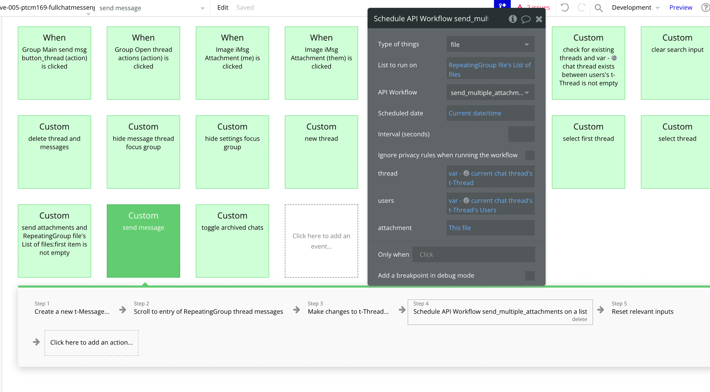 By default, users can attach multiple attachments when composing a message. However, the workflows are currently set up to only send the first attachment in the attachments list (RepeatingGroup file). To send multiple attachments when you click Group Main send msg button_thread (action), it would be best to use an API workflow. Your Bubble app would need to be on a paid Bubble plan to use API workflows.