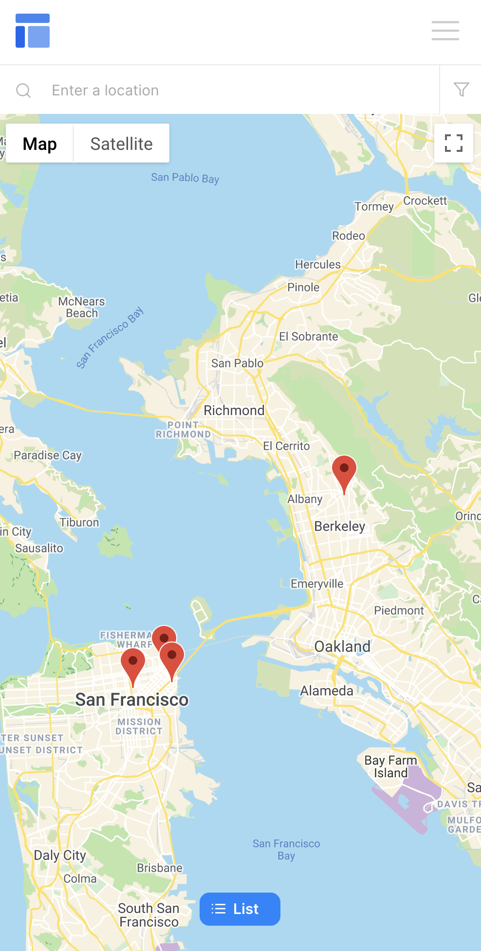 When the page width decreases to 1100 pixels or less, the Current User can toggle between a list view and a full-screen map view that adjusts in size based on the viewport.