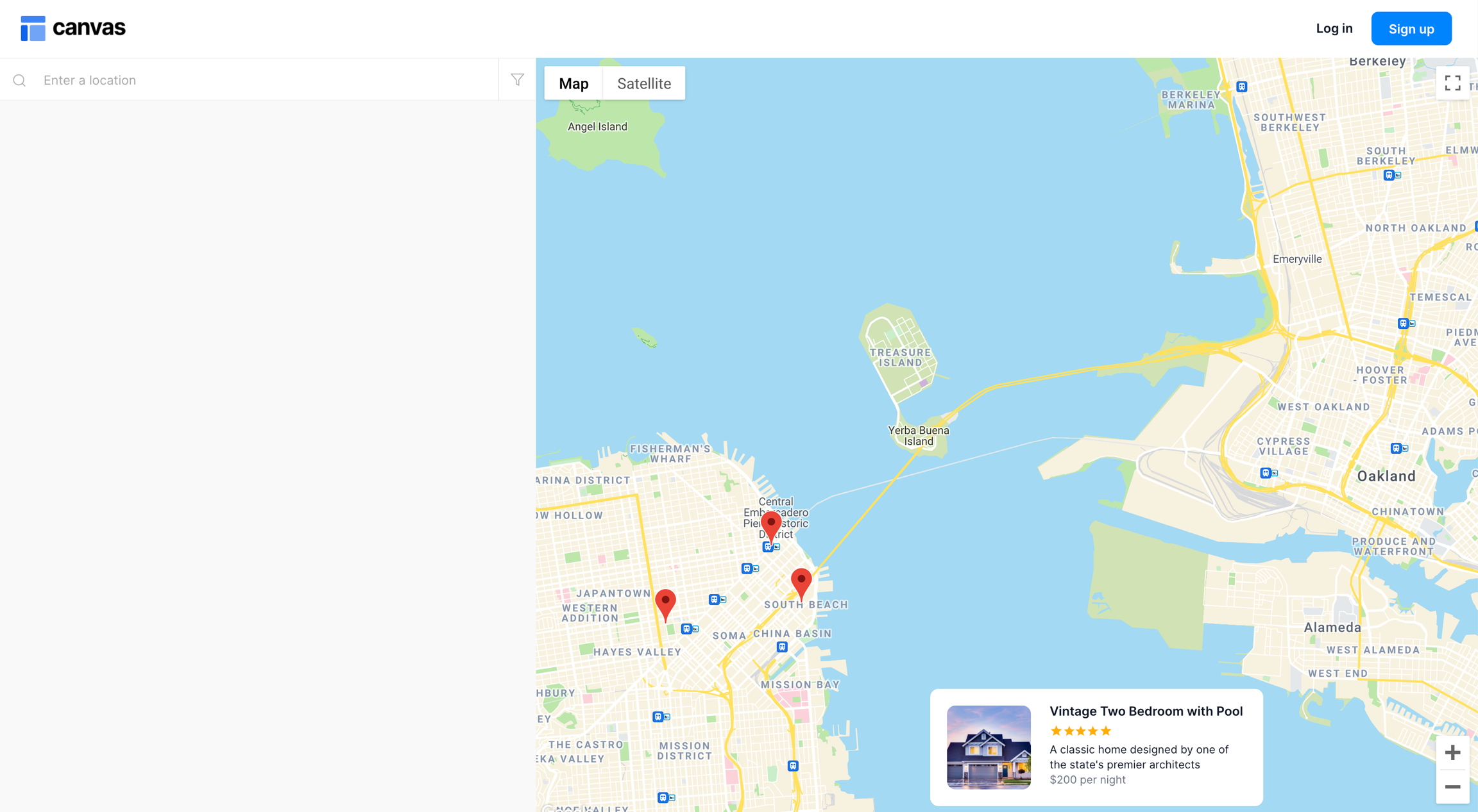 This page template includes a search bar element and a floating map that floats to the top and bottom of the page. You can add Canvas blocks to the left of the map; the map stays in a fixed position as you scroll the search results (similar to Airbnb).
