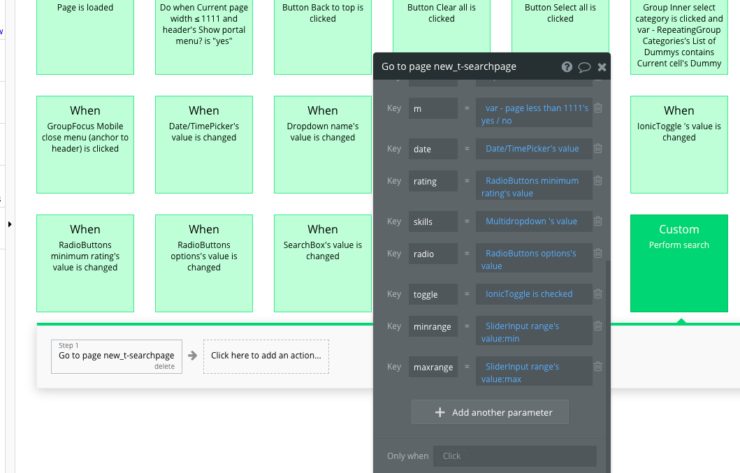 The main purpose of the “perform search” workflow is to adjust the parameters in the URL so that it contains the filters that the user has selected or entered. With that setup, a list of filtered results can be shared through these links that contain the filters in the URL (similar to sharing a specific list of results on Airbnb).