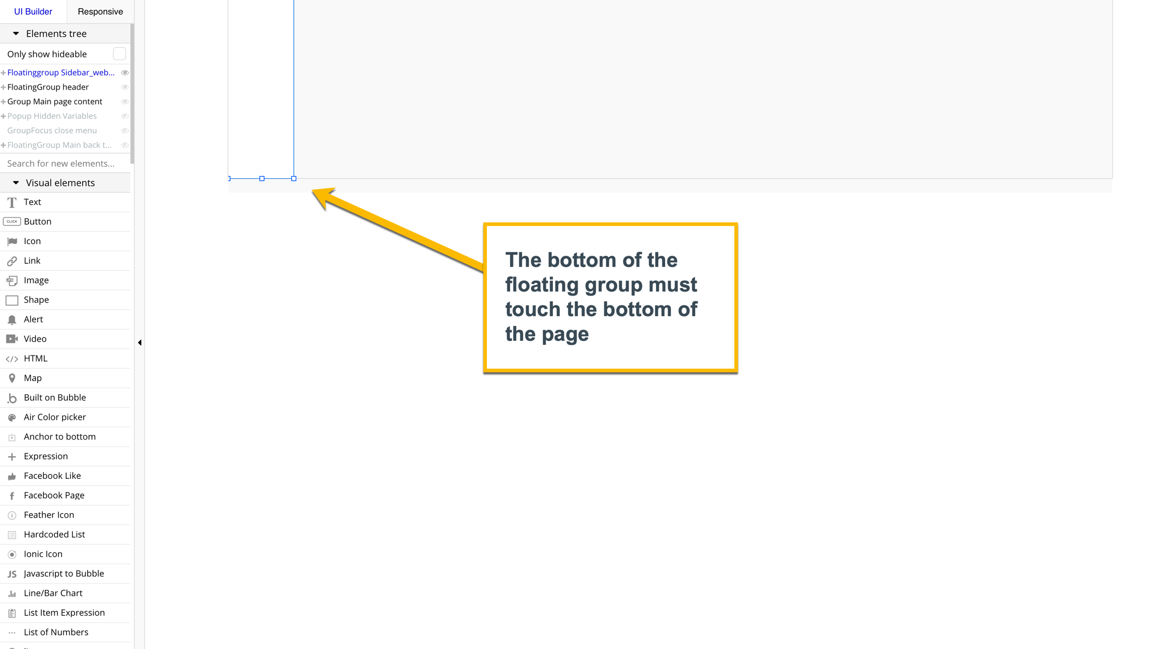 Floatinggroup Sidebar_website is set to float to both so that the sidebar is anchored to both the top and bottom of the page and allows for scrolling within the floating group. When a floating group is set to both, the floating group height needs to be the same height as the page height (i.e., the bottom of the floating group is aligned with the bottom of the page). If not, then the floating group will "disappear" when you preview the page.