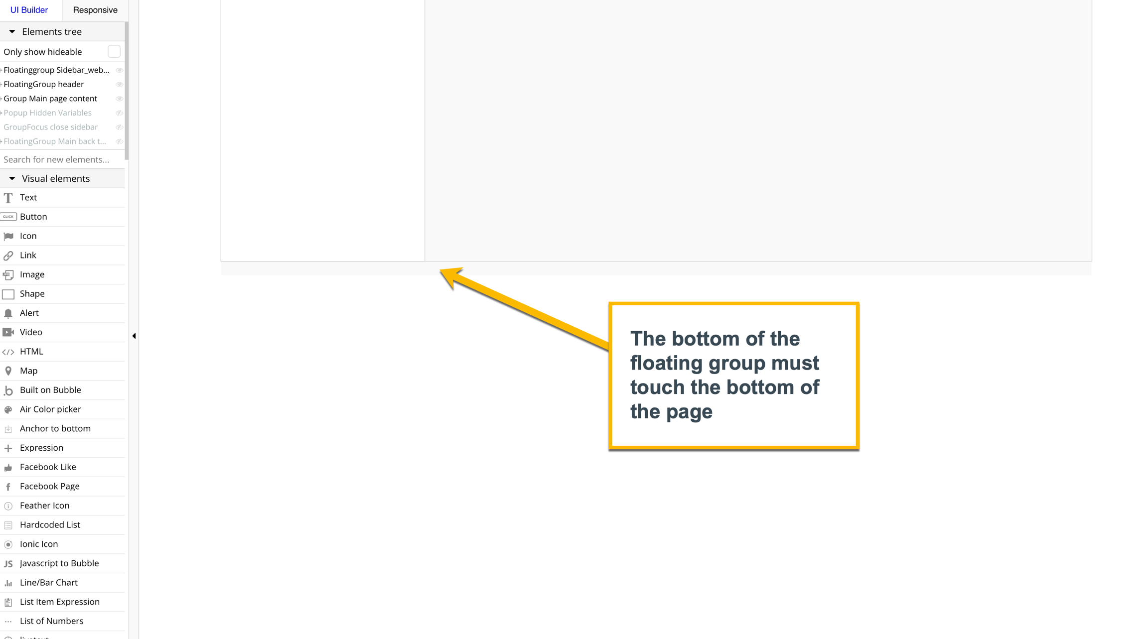 Floatinggroup Sidebar_website is set to float to both so that the sidebar is anchored to both the top and bottom of the page and allows for scrolling within the floating group. When a floating group is set to both, the floating group height needs to be the same height as the page height (i.e., the bottom of the floating group is aligned with the bottom of the page). If not, then the floating group will "disappear" when you preview the page.