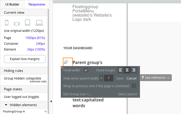 To hide the feather icons in the navigational tabs, you can go to the responsive tab in the Bubble editor and add a hiding rule to Group Inner nav # icon_text. Adding a hiding rule to a group will collapse the group horizontally when the parent width of the group is at a certain width.
