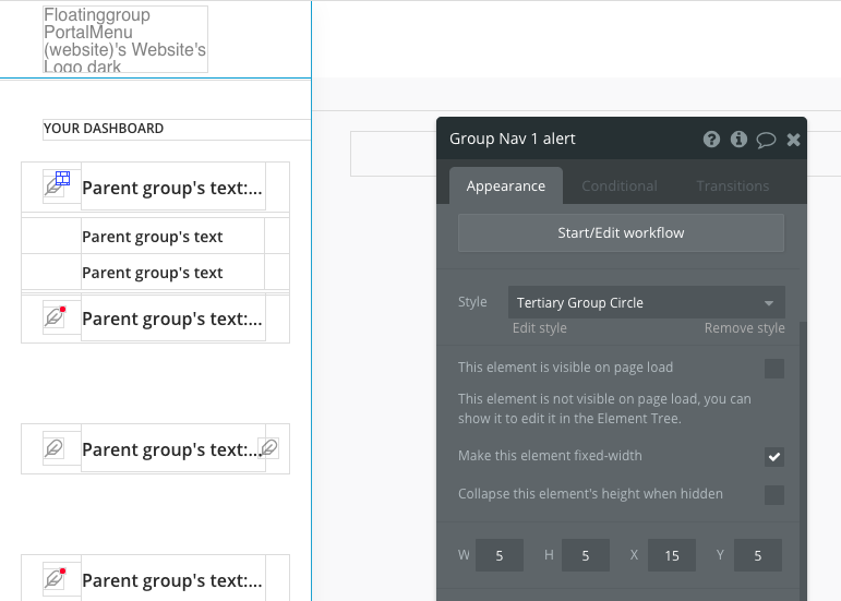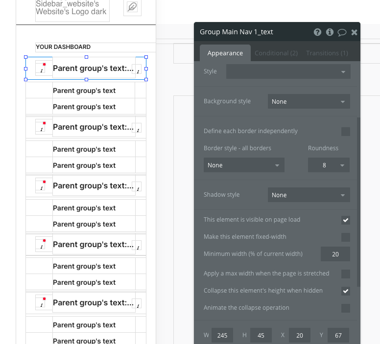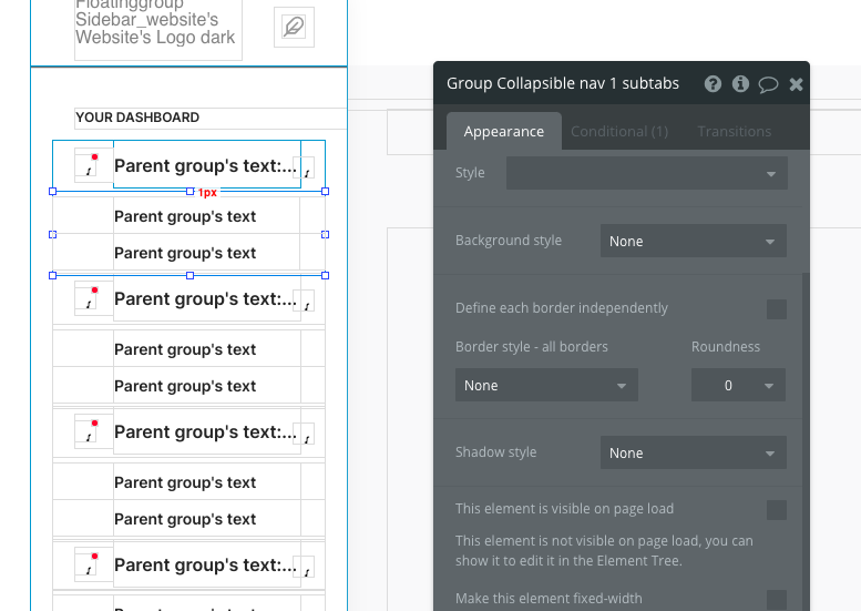Each Group Main Nav #_text comes with a collapsible subtab group, an alert group for notifications. These additional UIs are all hidden by default. To enable the subtab group, simply select the element, go to the conditional tab, and check the box for This element is visible on page load.