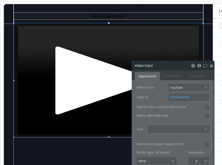 Group Main video list This group contains the UI for selecting a new video and a Repeating Group called RepeatingGroup Dummy.