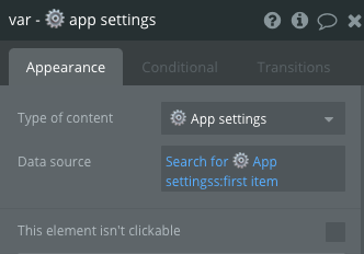 As an example, each page has a group element in this popup called 'var - ⚙️ app settings' with the type of content set to ⚙️ App Settings. The data source then is a 'Search for ⚙️ App Settings: first item'.