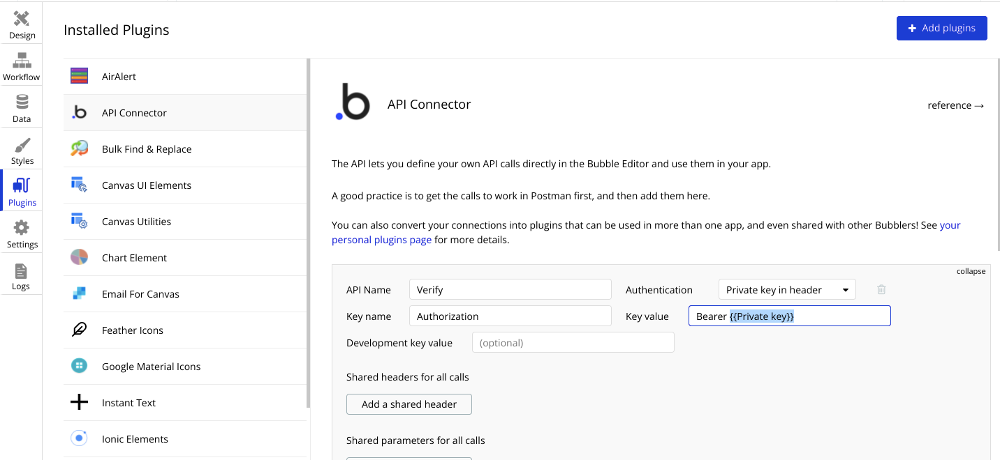 Once you have the key copied, replace the {{Private key}} value (make sure to keep the word Bearer) in the header of the Verify API call (Plugins tab > API connector > Verify).