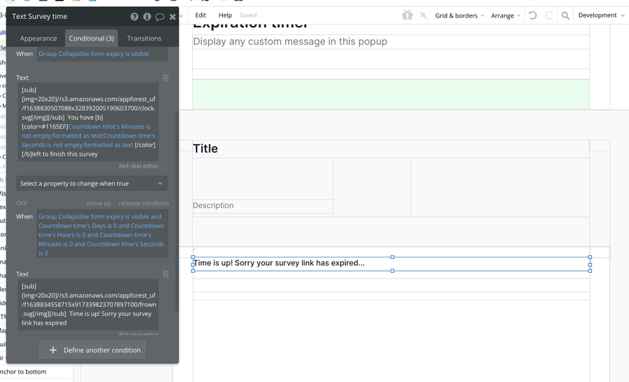 Select the text element in the group you've selected above, go to the conditional tab, and edit the message to display during countdown and when the timer is up.