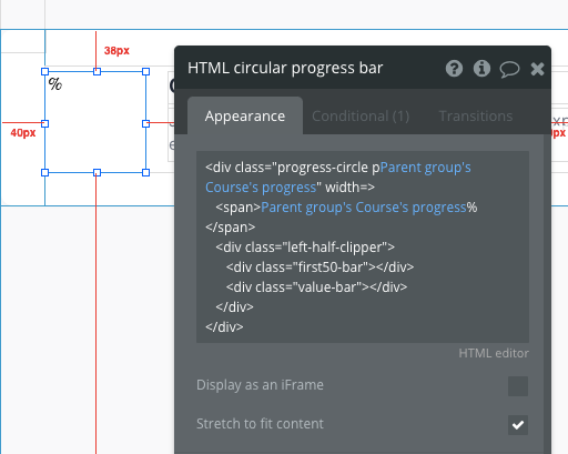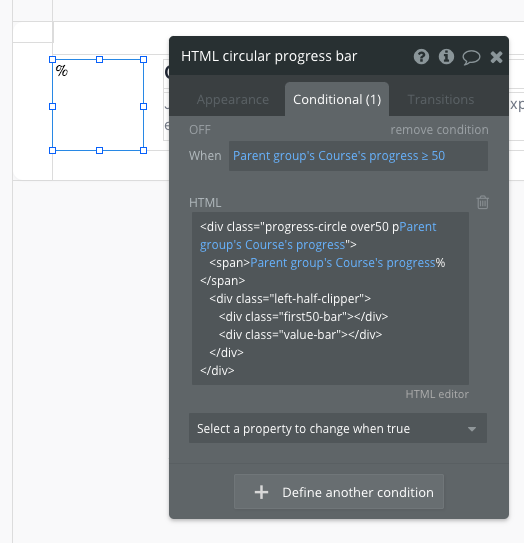 First, select HTML circular progress bar and you'll see the following code (bolded text represents where you'll input dynamic data): <div class="progress-circle p10" width=> <span>10%</span> <div class="left-half-clipper"> <div class="first-50-bar"></div> <div class="value-bar"></div> </div> </div> There is also a conditional statement that looks a bit different: <div class="progress-circle over50 p10" width=> <span>10%</span> <div class="left-half-clipper"> <div class="first-50-bar"></div> <div class="value-bar"></div> </div> </div>