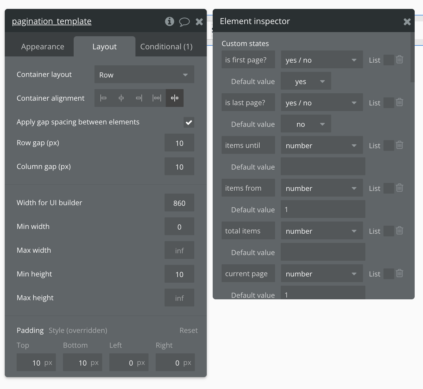 This pagination block is a reusable element called **pagination\_template** and it uses a number data source. You will need to pass the repeating group you're paginating's data source's count to this pagination block.