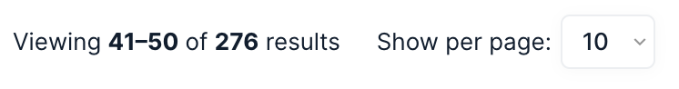 This group contains the text for tracking the results the user is viewing (e.g. Viewing 1–50 of 2,500 results). It also includes the show per page dropdown, where the user can toggle between the maximum number of items to display per page. This group will be hidden when the current page's width is less than or equal to 615.<br>