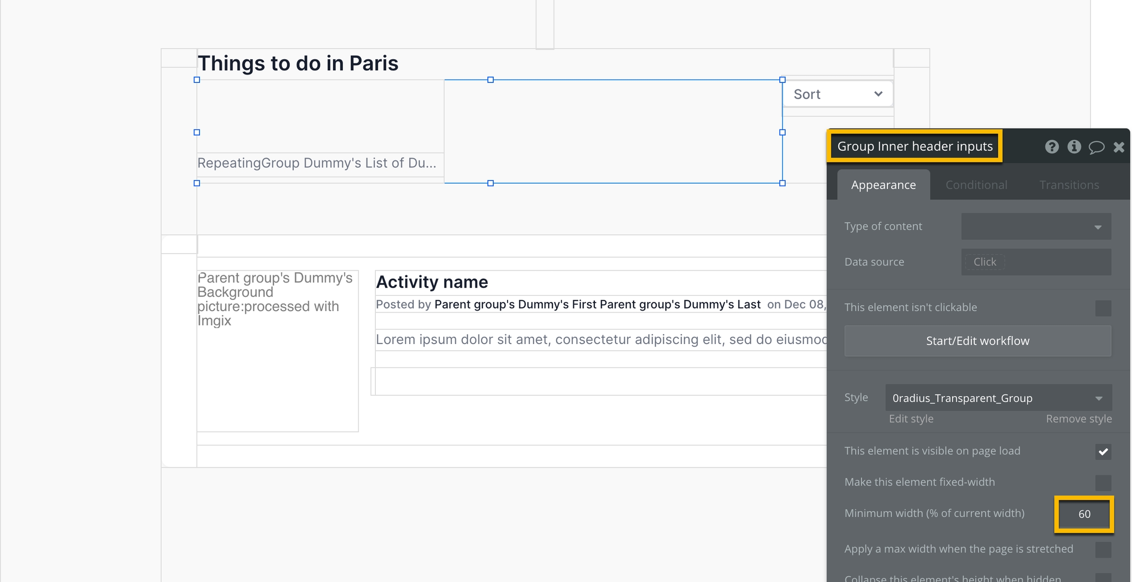 2. Expand the Group Inner header inputs element so that it touches the Group Collapsible Sort Filter and Button element.