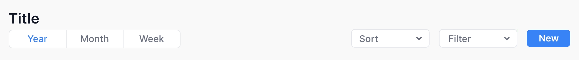 This block includes a title, dropdown, toggle tabs, description text, sort dropdown, filters, and a new button. This group should be used when you need to add a title group above a section of content.