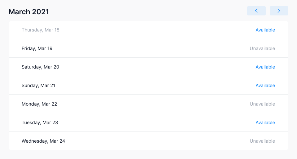 This block shows the availability of each day of one week at a time and allows the user to toggle left and right between weeks. Ideal for booking / Airbnb-type applications where you need to show a calendar for availabilities.