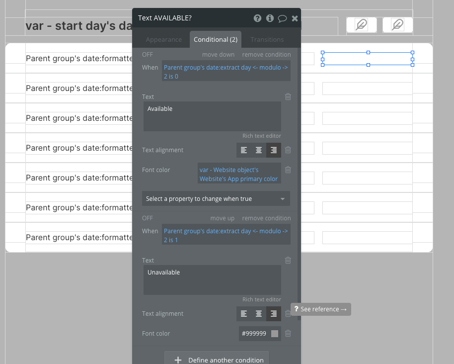 var - start dayto include any filters you needUpdate the placeholder conditionals on Text AVAILABLE? elements