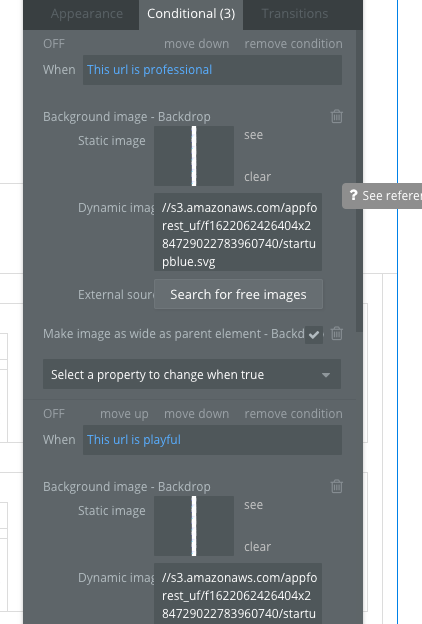 * To use one of these backgrounds, simply toggle to the 'Appearance' tab and copy and paste the image settings from the 'Conditional' tab over.
