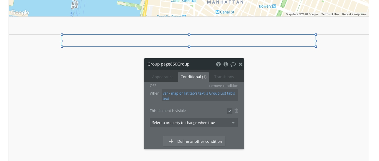 Clicking on Group Inner map tab_text or Group Inner list tab_text will set var - view map or list tab's data source to that group's text. This will change the current tab that the user is viewing.