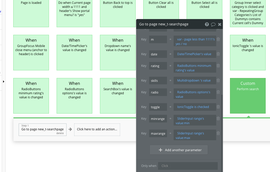 The main purpose of the “perform search” workflow is to adjust the parameters in the URL so that it contains the filters that the user has selected or entered. With that setup, a list of filtered results can be shared through these links that contain the filters in the URL (similar to sharing a specific list of results on Airbnb).
