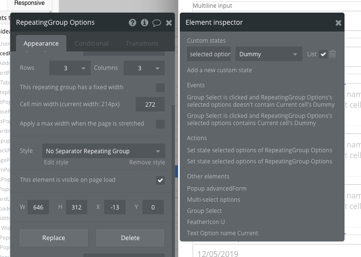 • RepeatingGroup Options has a custom state selected options of type Dummy. Modify the custom state's type.