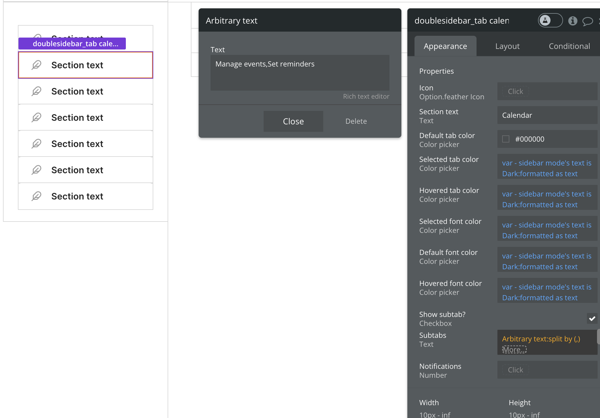**Overview:** Used as sidebar tabs in [Double Sidebar Portal](https://docs.airdev.co/canvas/5.2/canvas-library/page-templates/double-sidebar-portal-page-template) page templates. You can copy and paste an existing doublesidebar\_tab and define the [reusable element properties](https://manual.bubble.io/core-resources/elements/reusable-elements#reusable-element-properties) below: