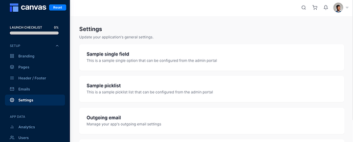 You can now include app-wide settings here that can be easily managed from the front-end (e.g. single field or a picklist). For more information on how to use these, please read our documentation here.