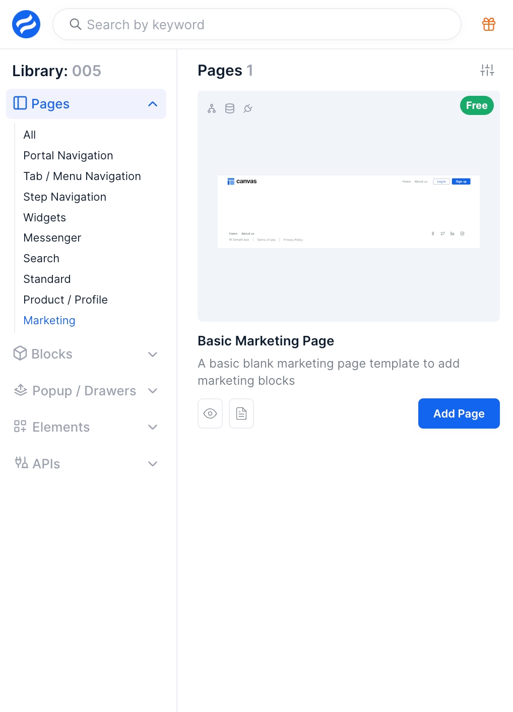 To build your marketing page from scratch, you should select this page template. You can further customize it by using the Canvas extension to add more marketing blocks and Canvas elements.